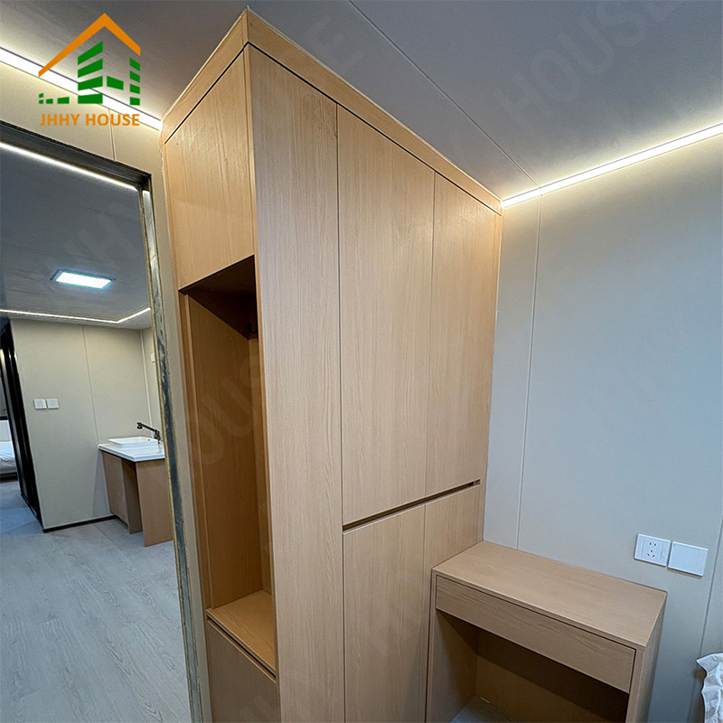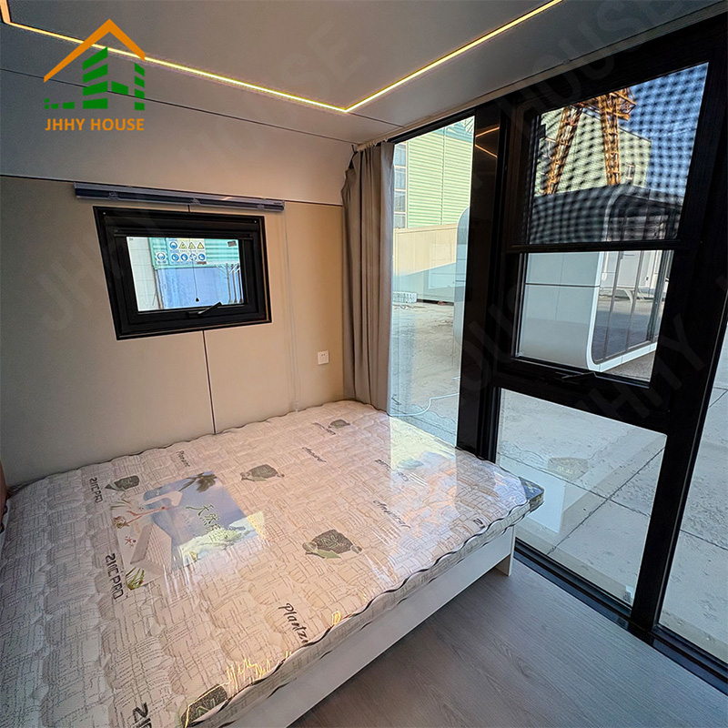 | система оформления интерьера | Подвесной потолок (плиты OSB + плиты из углеродного волокна) Внутренняя поверхность стен (плита OSB + плита из углеродного волокна) (плиты + плиты из углеродного волокна) Напольное покрытие для внутренних помещений (SPC lock flooring) системы подогрева пола Дверь в ванную комнату (раздвижная стеклянная дверь для обеспечения приватности). Раковина (мраморная, изготовленная на заказ) Стены ванной комнаты (плиты с защитным покрытием SPC) Пол в ванной комнате (плитка) Мебель, такая как кровати, прикроватные тумбочки, диваны и т. д. (может быть изготовлена на заказ). |