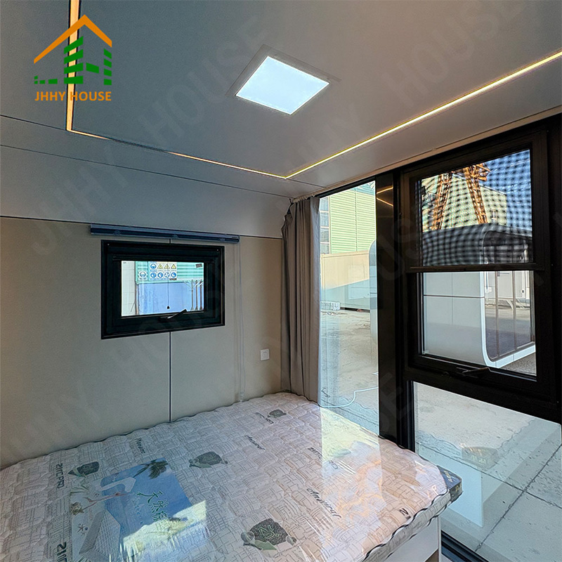 | система оформления интерьера | Подвесной потолок (плиты OSB + плиты из углеродного волокна) Внутренняя поверхность стен (плита OSB + плита из углеродного волокна) (плиты + плиты из углеродного волокна) Напольное покрытие для внутренних помещений (SPC lock flooring) системы подогрева пола Дверь в ванную комнату (раздвижная стеклянная дверь для обеспечения приватности). Раковина (мраморная, изготовленная на заказ) Стены ванной комнаты (плиты с защитным покрытием SPC) Пол в ванной комнате (плитка) Мебель, такая как кровати, прикроватные тумбочки, диваны и т. д. (может быть изготовлена на заказ). |