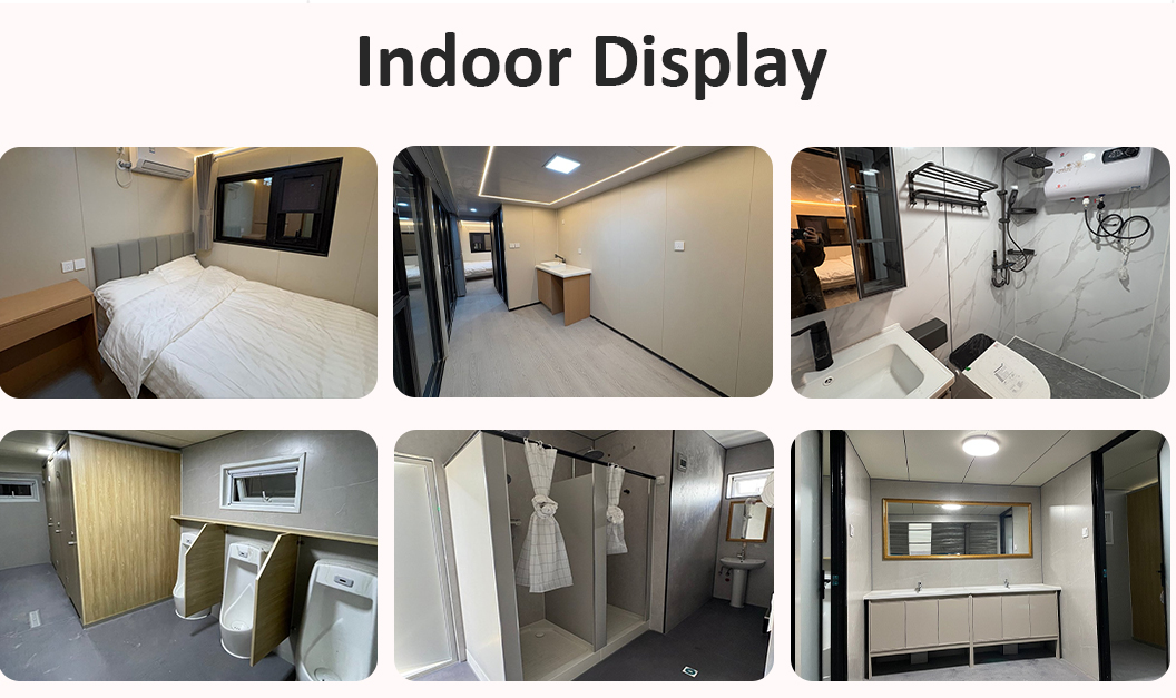 Suspended ceiling (OSB board+carbon fiber board) Interior wall surface(OSB board+carbon fiber board) board+carbon fiber board)Indoor flooring (SPc lock flooring) Underfloor heating systems Bathroom door(privacy sliding glass door) Washbasin (marble customized) Bathroom walls (SPC lock board) Bathroom floor (tiles) Furniture such as beds, nightstands, sofas, etc. (can be customized) |