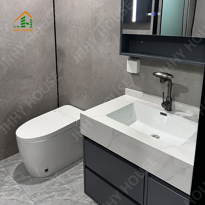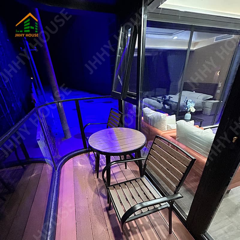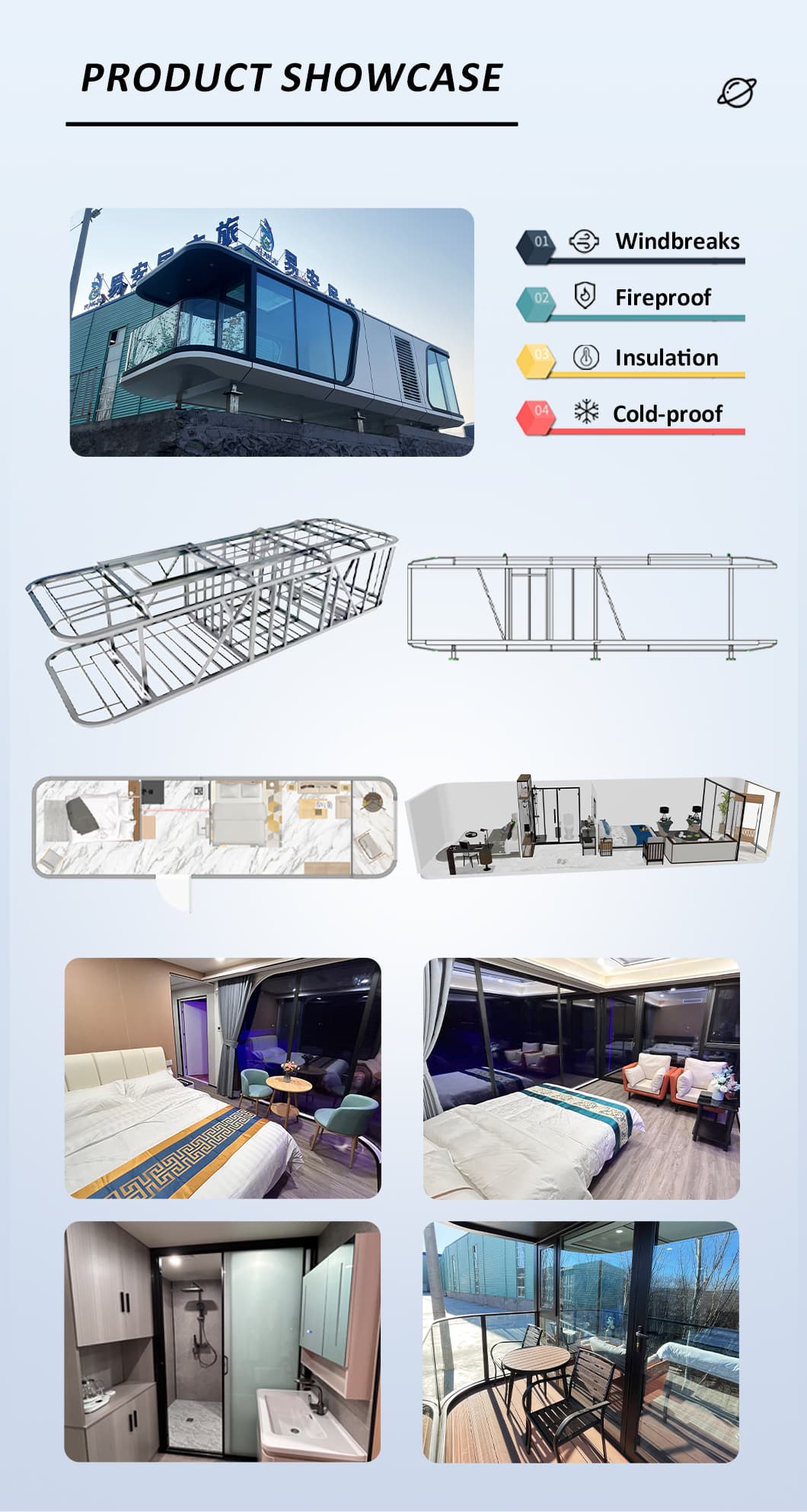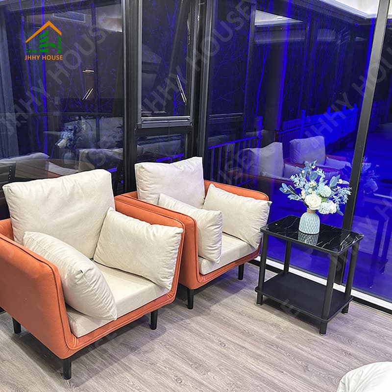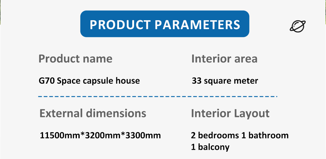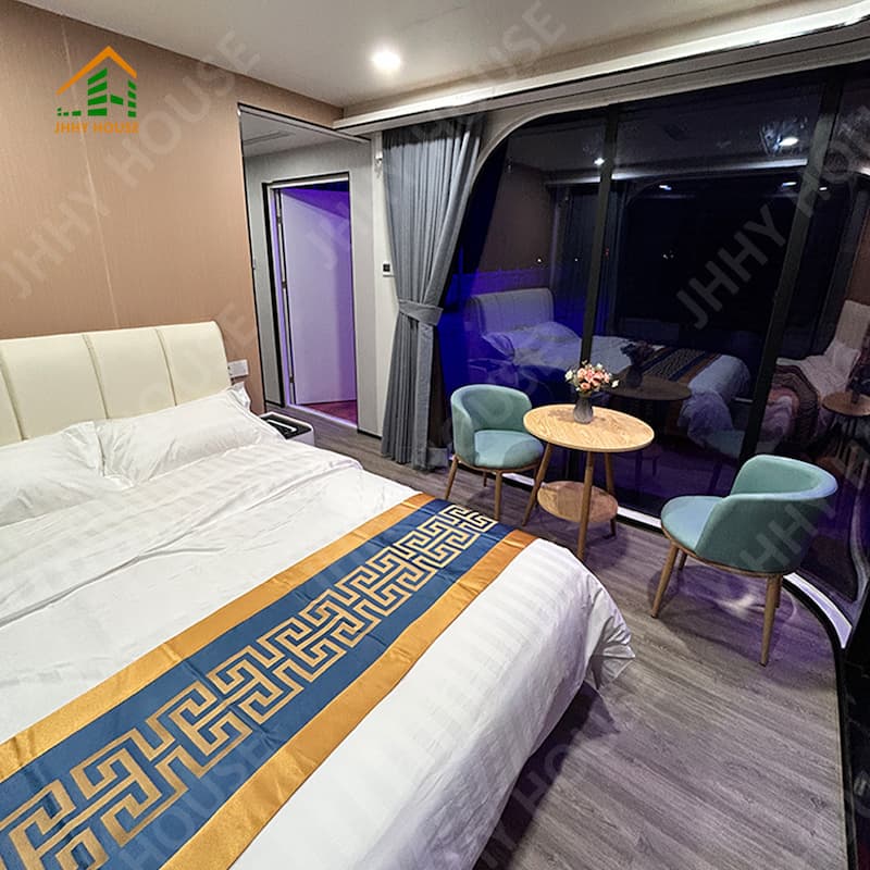 | Система внутренней отделки | Подвесной потолок (OSB-плита+углеволоконная плита) Внутренняя поверхность стены (OSB-плита + углеволоконная плита) доска + карбоновая плита) Внутреннее напольное покрытие (замковое покрытие SPc) Системы напольного отопления Дверь в ванную комнату (раздвижная стеклянная дверь для обеспечения приватности) Раковина (мраморная, по индивидуальному заказу) Стены ванной комнаты (замковая доска SPC) Пол в ванной (плитка) Мебель, такая как кровати, тумбочки, диваны и т. д. (можно изготовить по индивидуальному заказу) |